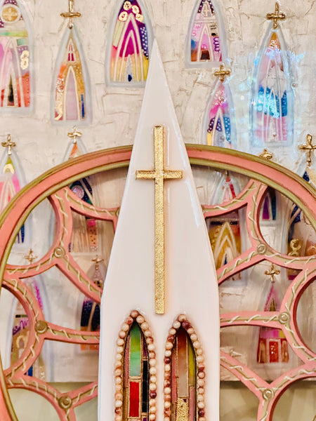 Once constructed, the cathedrals are delivered to Laura Rice of Ozark Alabama. Laura, is widely known for her breathtaking collage art. She painstakingly & meticulously creates each piece of collage by hand coloring the papers, cutting them and placing each piece. The crosses all receive a beautiful coating of gold leaf. The finishing touch being the resin which is hand poured over each cathedral giving it her signature shine!