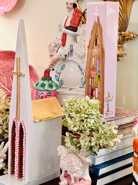 Once constructed, the cathedrals are delivered to Laura Rice of Ozark Alabama. Laura, is widely known for her breathtaking collage art. She painstakingly & meticulously creates each piece of collage by hand coloring the papers, cutting them and placing each piece. The crosses all receive a beautiful coating of gold leaf. The finishing touch being the resin which is hand poured over each cathedral giving it her signature shine!