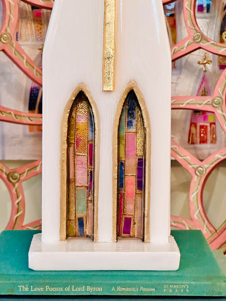 This cathedral front features a gold leaf cross, two hand collaged windows & a resin finish. It measures approximately 15x 4.5x 2. It can be displayed by sitting or hanging on the wall. Each cathedral is handmade & unlike any of the others.