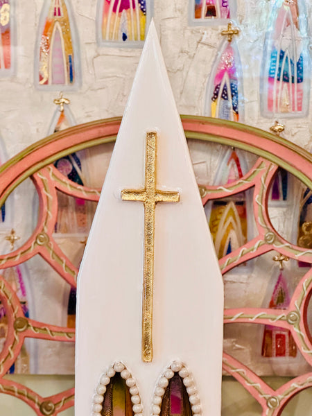Once constructed, the cathedrals are delivered to Laura Rice of Ozark Alabama. Laura, is widely known for her breathtaking collage art. She painstakingly & meticulously creates each piece of collage by hand coloring the papers, cutting them and placing each piece. The crosses all receive a beautiful coating of gold leaf. The finishing touch being the resin which is hand poured over each cathedral giving it her signature shine!