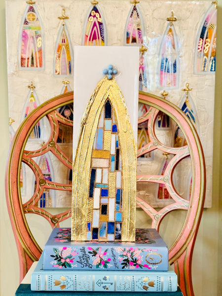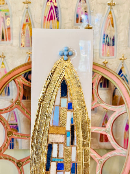 Laura Rice is known for her breathtaking cathedral pieces. She beautifully creates stain glass by mixing the most exquisite colors & textures. This original piece has a resin glaze which perfectly enhances the beauty & shine of the cathedral. Each bead is hand rolled & placed