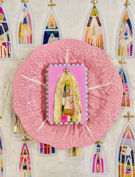 Laura Rice is known for her breathtaking cathedral pieces. She beautifully creates stain glass by mixing the most exquisite colors & textures. This original piece has a resin glaze which perfectly enhances the beauty & shine of the cathedral.