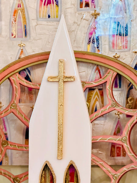 Once constructed, the cathedrals are delivered to Laura Rice of Ozark Alabama. Laura, is widely known for her breathtaking collage art. She painstakingly & meticulously creates each piece of collage by hand coloring the papers, cutting them and placing each piece. The crosses all receive a beautiful coating of gold leaf. The finishing touch being the resin which is hand poured over each cathedral giving it her signature shine!